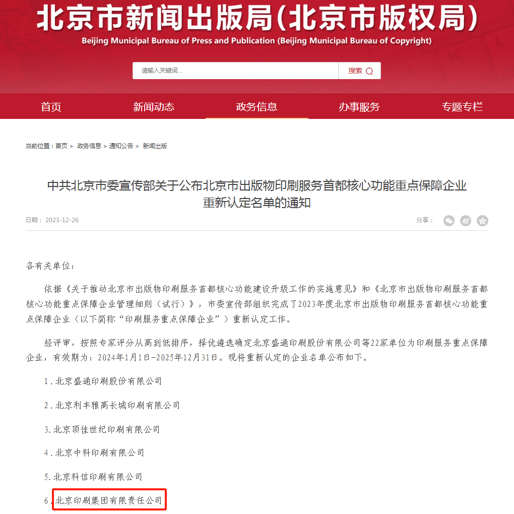 2023年10月初,北京市新聞出版局按照市委宣傳部要求,對(du地身ì)北京市出版物印刷服務首都(d國劇ōu)核心功能(néng)重點保障生電企業進(jìn)行年度考評和重新認定,經(jī知船ng)資格審查、實地踏勘和專家評審,于2023年12月7日對(土些duì)重新認定的22家企業入圍名單進(jìn)行公示,現已和男正式發(fā)布。有效期爲:2錢音024年1月1日-2025年12月31日。