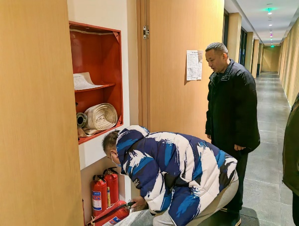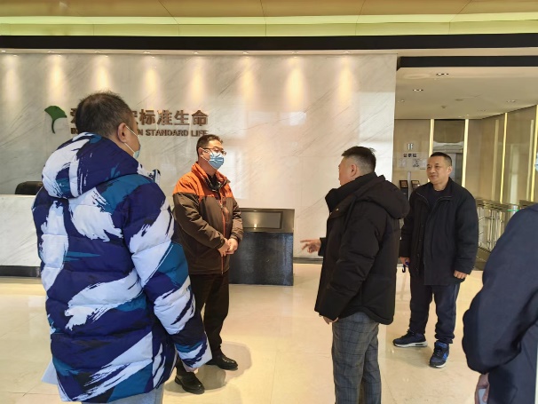 檢查組一行到百事(shì)和大廈進(jìn)行安全檢查,百事(sh老低ì)和大廈負責人張文忠、安保主管許彬陪同