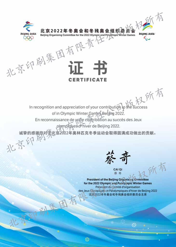 北京2022年冬奧會(huì)和冬殘奧會(huì)組織委員會(huì)音睡證書